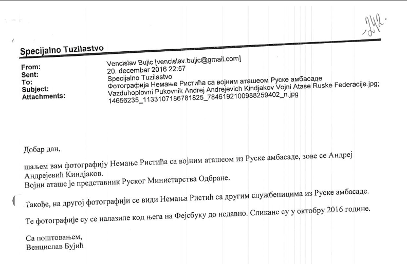 Портал ИН4С ексклузивно објављује документ који потврђује умијешаност Бујића у монтирање афере „Државни удар“. Он је, наиме, 20. децембра 2016. године у касним ноћним сатима (22:57) послао мејл Специјалном државном тужилаштву Црне Горе са фотографијама Немање Ристића и војног аташеа из Амбасаде Русије у Београду.