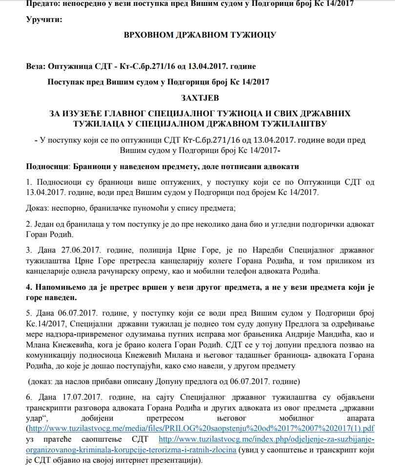 Дана 06.07.2017. године, у поступку који се води пред Вишим судом у Подгорици број Кс.14/2017, Специјални државни тужилац је поднео том суду допуну Предлога за одређивање мере надзора-привременог одузимања путних исправа мог брањеника Андрије Мандића, као и Милана Кнежевића, кога је бранио колега Горан Родић. СДТ се у тој допуни предлога позвао на комуникацију подносиоца Кнежевић Милана и његовог тадашњег браниоца – адвоката Горана Родића, до које је дошао поступајући, како смо навели, у другом предмету(доказ: да наслов прибави описану Допуну предлога од 06.07.2017. године)