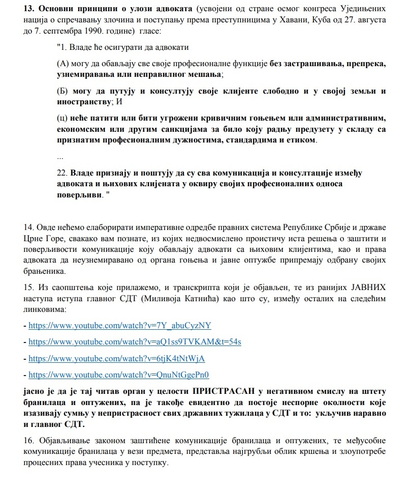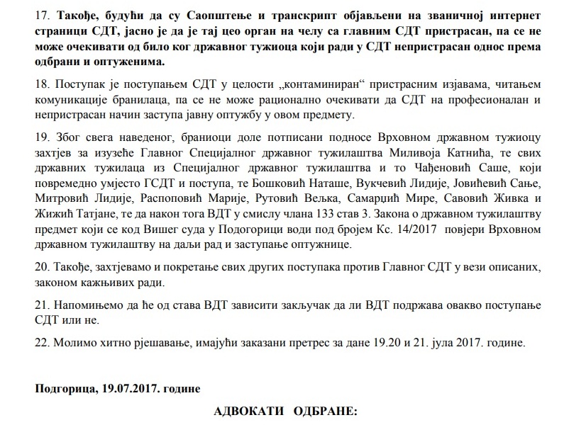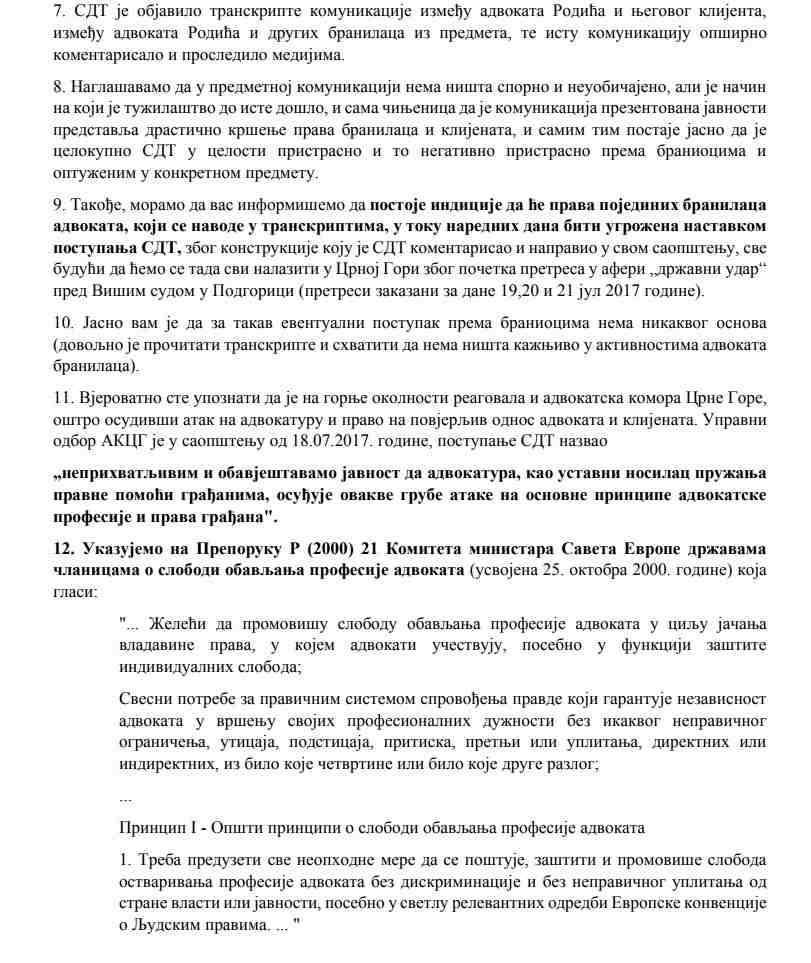 Такође, морамо да вас информишемо да постоје индиције да ће права појединих бранилаца адвоката, који се наводе у транскриптима, у току наредних дана бити угрожена наставком поступања СДТ, због конструкције коју је СДТ коментарисао и направио у свом саопштењу, све будући да ћемо се тада сви налазити у Црној Гори због почетка претреса у афери „државни удар“ пред Вишим судом у Подгорици (претреси заказани за дане 19,20 и 21 јул 2017 године).