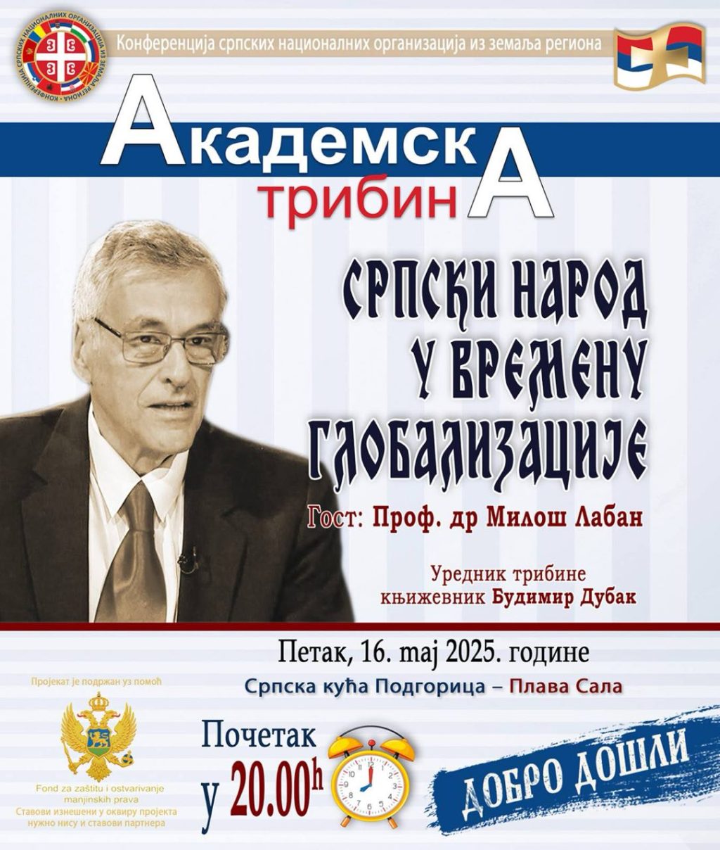 У Српској кући у Подгорици, 16. маја 2025. године с почетком у 20 часова, биће одржана академска трибина под називом „Српски народ у времену глобализације“.