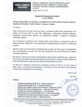 Овим писмом Албанског националног савјета поставља се питање коме припада општина Улцињ и како неко може да забрани Митрополиту Амфилохију да шири Божију ријеч у митрополији на чијем је трону по Божијим и људских законима?