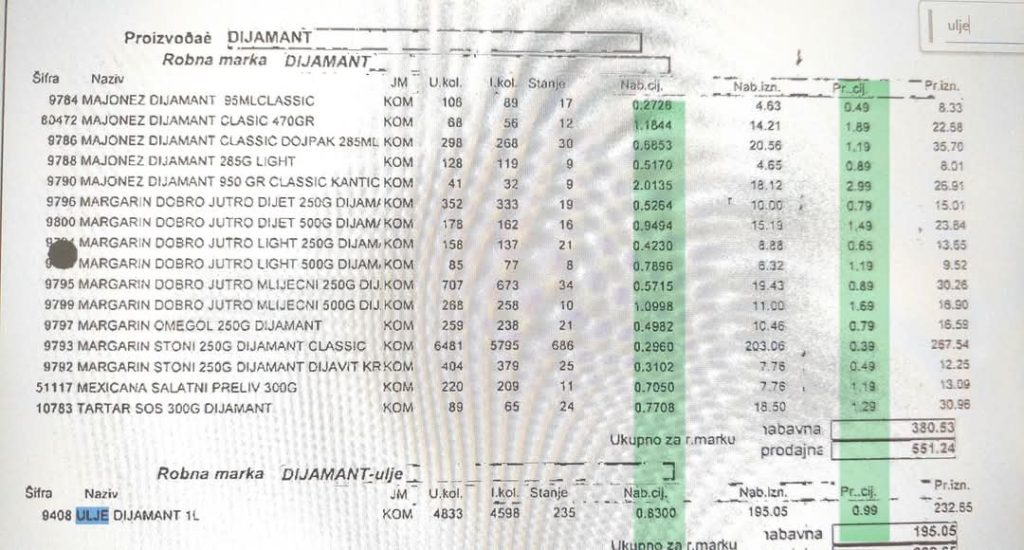 “У њему ћете видјети да БРУТО МАРЖЕ које зарачунавају црногорски маркети нијесу ни изблиза онолике коликим их је представио г-дин Бокан. Бруто МАРЖЕ на нивоу региона би требало да се крећу негдје око 23.7%, на основу података Економског института у Загребу, док су на нивоу ЕУ још ниже (зато су цијене производа тамо ниже!). Код нас се те МАРЖЕ крећу изнад 30%! У прилогу су слике неких производа из ХДЛ Лаковића, из документа који је предао ИРФ-у 2021. године. Од тада до данас цијене су расле брже од раста цијена дистрибутера, тј. трговински ланци су зарачунали ДОДАТНЕ МАРЖЕ на ове цијене. Видјећете да већина маржи прелази 32-33%! Треба нагласити да ВОЛИ има много веће марже, јер држи највећи дио тржишта, иако су му цијене готово исте као у другим маркетима.