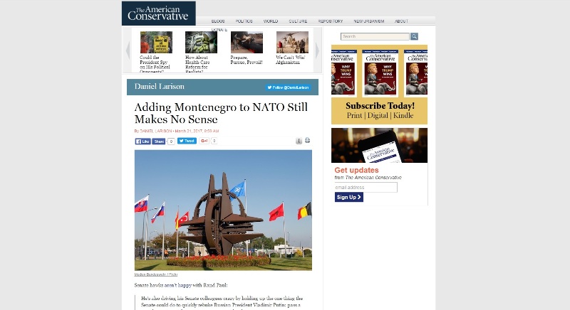 Прикључење Црне Горе неће учинити савез сигурнијим, али ће наградити корумпирану владу, која има ауторитативне теденције, интеграцијом у моћну западну институцију.