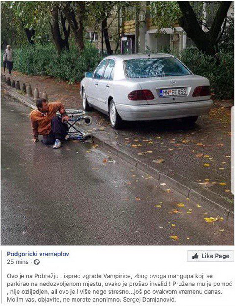На Побрежју, испред зграде Вампирице, један возач је паркирао своје возило на тротоару, због чега је блокирао пролаз особи са инвалидитетом, која је приликом покушаја да се “провуче”, пала на пут са инвалидских колица.