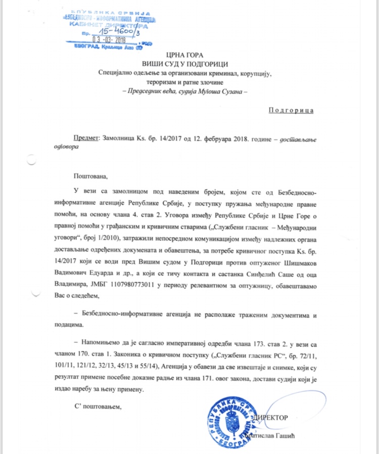 “У вези са замолницом којом сте од БИА Србије затражили достављање одређених докумената и обавјештења, за потребе кривичног поступка Кс. Бр. 14/2017 који се води пред Вишим судом у Подгорици против оптуженог Едуарда Шишмакова и других, а који се тичу контаката и састанака Саше В. Синђелића, у периоду релевантом за оптужницу, обавјештавамо Вас о сљедећем: Безбједносно-информативна агенција Србије не располаже траженим документима и подацима. Напомињемо да је сагласно императивној одредби Законика о кривичном поступку Србије, Агенција у обавези да све извјештаје и снимке, који су резултат примјене посебне доказне радње, достави судији који је издао наредбу за њену примјену”, пише у званичном документу који је БИА прослиједила Министарству правде Црне Горе. Тај документ је лично потписао Братислав Гашић, шеф БИА Србије.