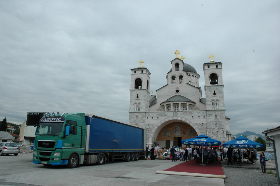 Испред подгоричког Саборног храма Васкрсења Христовог данас су кренула два шлепера помоћи угроженима од поплава у Србији и Републици Српској.