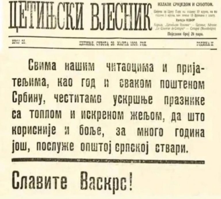 ,,Цетињски вјесник“ на Васкрс, 28. март 1909. година Свима нашим читаоцима и пријатељима, као год и сваком поштеном Србину, честитамо...