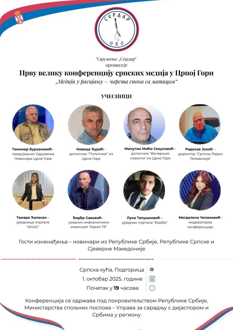 Удружење „Сердар“ организује велику конференцију сабрања српских медија у Црној Гори, под називом „Медији у расејању – чврста спона са...