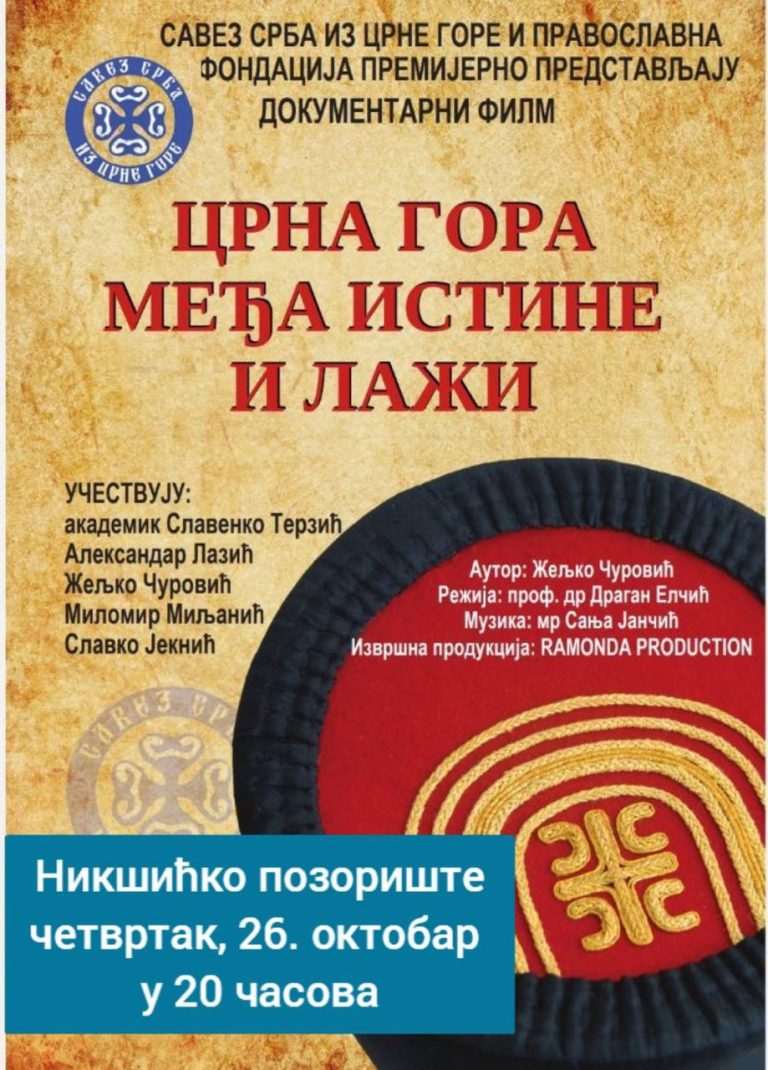 Savez Srba iz Crne Gore i Pravoslavna fondacija premijerno predstavljaju dokumentarni film „Crna Gora međa istine i laži“ većeras u...