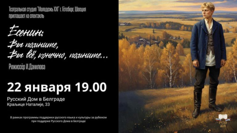 Поетско вече испуњено емоцијама и лириком Сергеја Јесењин, једног од највећих руских песника, биће уприличено у четвртак увече, 22. јануара...