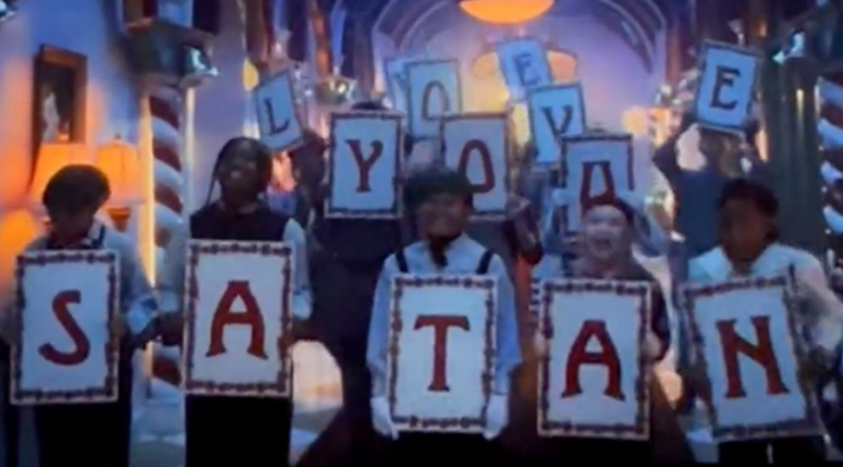 У Дизнијевој серији Дједа Мразови, поводом Божићних празника, дјеца носе слова с поруком „Сотоно, волимо те“. Свако дијете носи по...