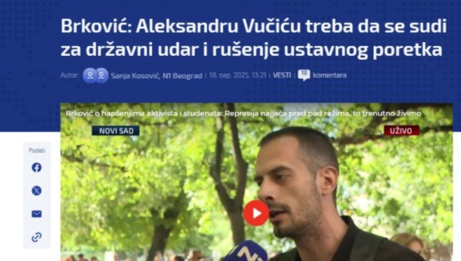 Podsjetimo, Brković, koji se predstavlja i kao aktivista pokreta „Bravo“, pred kamerama tajkunske N1 najavio je „rušenje aktuelne vlasti u Srbiji“.