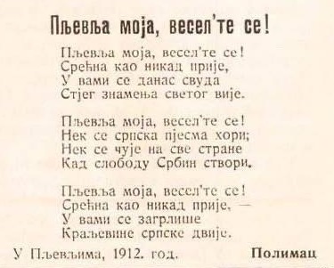Пљевља моја, весел’те се! Нек’ се српска пјесма хори, нек’ се чује на све ствари, кад слободу Србин твори. Пљевља моја, весел’те се! Срећна као никад прије, у вами се загрлише – краљевине српске двије, стихови су које је објавио ,,Цетињски вјесник“ 1912. године, поводом ослобођења српских Пљеваља од турског ропства.