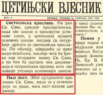 „Светосавска прослава. На дан Св. Саве, српског просвјетитеља, када све школе и просвјетне установе славе, у цетињској мушкој основној школи послије св. литурђије цржаће се Светосавска прослава“, пише у чланку из 1909. и додаје: