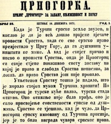 Лист „Црногорка“ у тексту о пропасти Српског царства и наставку борбе у Црној Гори 1871. године пише да је Црна Гора доказ да Српство није пропало.