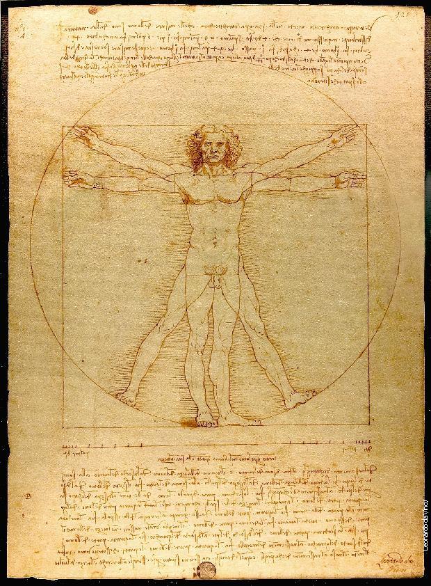 Цртеж пером и тушем нагог мушког лика у две позе које се преклапају, са рукама и ногама затвореним унутар круга и квадрата, створио је ренесансни полихистор око 1490. године. То је студија идеалног људског облика, делимично под утицајем дела римског архитекте Марка Витрувија Полија, који је веровао да људско тело има хармоничне пропорције, баш као и добро осмишљен храм.