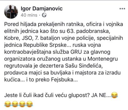 Поред хиљада прекаљених ратника, официра и војника елитних јединица као што су 63. падобранска, Кобре, ЈСО, 7. батаљон војне полиције, специјалних једница Републике Српске… руска војна контраобавјештајна служба ГРУ за главног организатора оружаног устанка у Монтенегру регрутовала је дезертера Сашу Синђелића, продавца мајци са бувљака и мајстора за израду кућица… и то преко Фејсбука...