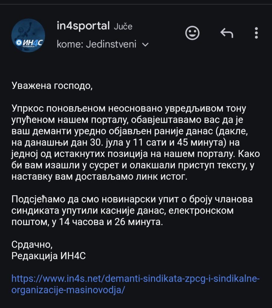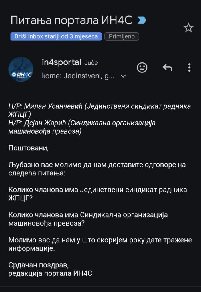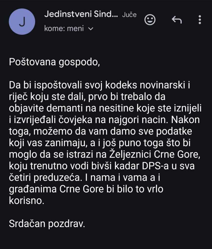 Редакција портала ИН4С недавно је објавила истраживачки текст под насловом: „Може ли бивши шверцер наркотика водити синдикат у државном предузећу?“, у којем се, на основу јавно доступних података, поставља сасвим легитимно питање – да ли је морално примјерено да лице које је правоснажно осуђено због шверца 50 килограма марихуане предводи синдикалну организацију у државној фирми и наступа у име радника према институцијама. Након објаве текста, редакцији су се заједнички обратили Јединствени синдикат радника ЖПЦГ и Синдикална организација машиновођа, чији је предсједник управо Дејан Жарић – лице из наслова нашег текста. Саопштење које су упутили назива се демантијем, али у њему нема ниједне чињенице која би оповргла било шта изнесено у нашем тексту. Умјесто тога, саопштење садржи етикетирање портала ИН4С, неосноване оптужбе о „нарученом тексту“ и „злонамјерним намјерама“, као и проширену критику менаџмента Жељезничког превоза Црне Горе, који је у нашем оригиналном тексту тек успутно поменут.