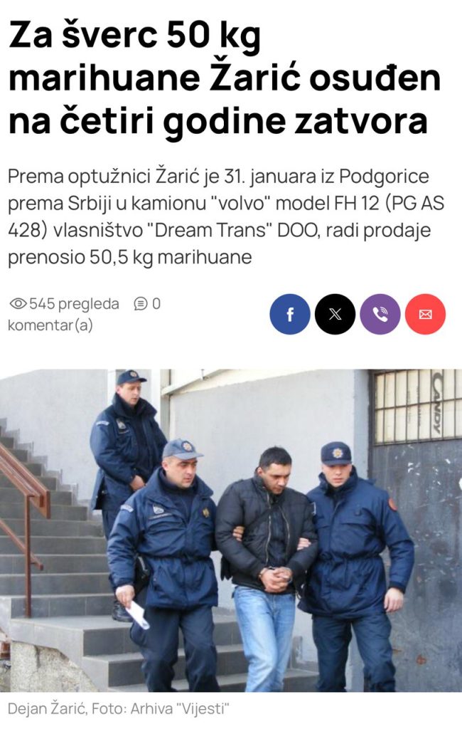 Фото: Дејан Жарић у тренутку хапшења 2011. године због покушаја шверца 50 килограма марихуане. Данас води синдикалну организацију у државној фирми ЖПЦГ. Извор фотографије: Вијести