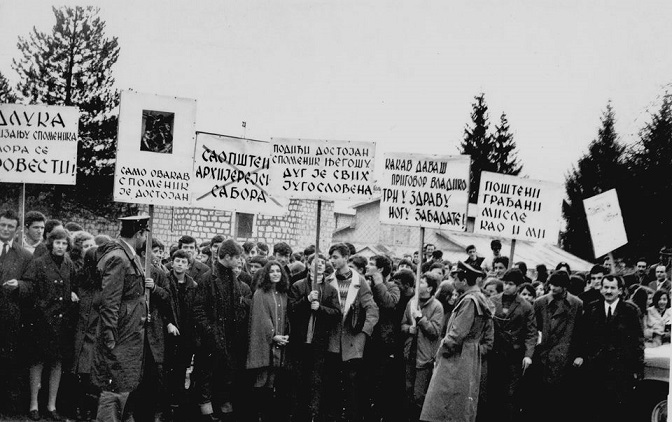 Протест цетињских гимназијалаца против митрополита Данила Дајковића и његовог приговора поводом рушења Његошеве капеле, 18. 3. 1969. (Фото: Фејсбук страница Јована Маркуша)