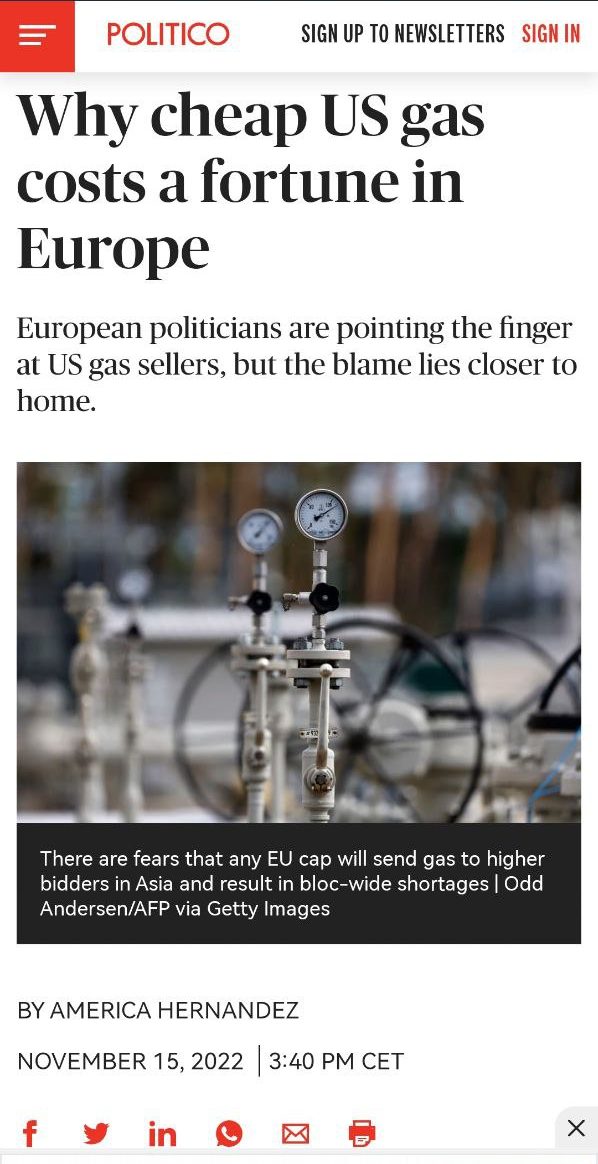 Лидери ЕУ хтели су да разговарају о високим ценама гаса са америчким председником на самиту Групе 20 на Балију, али је Бајден „изгледао несвестан тог питања“, рекао је високи званичник ЕУ. Дејвид Клајман из Истраживачког центра Бригел наводи да су „Европљани видно фрустрирани недостатком информација и консултација”.