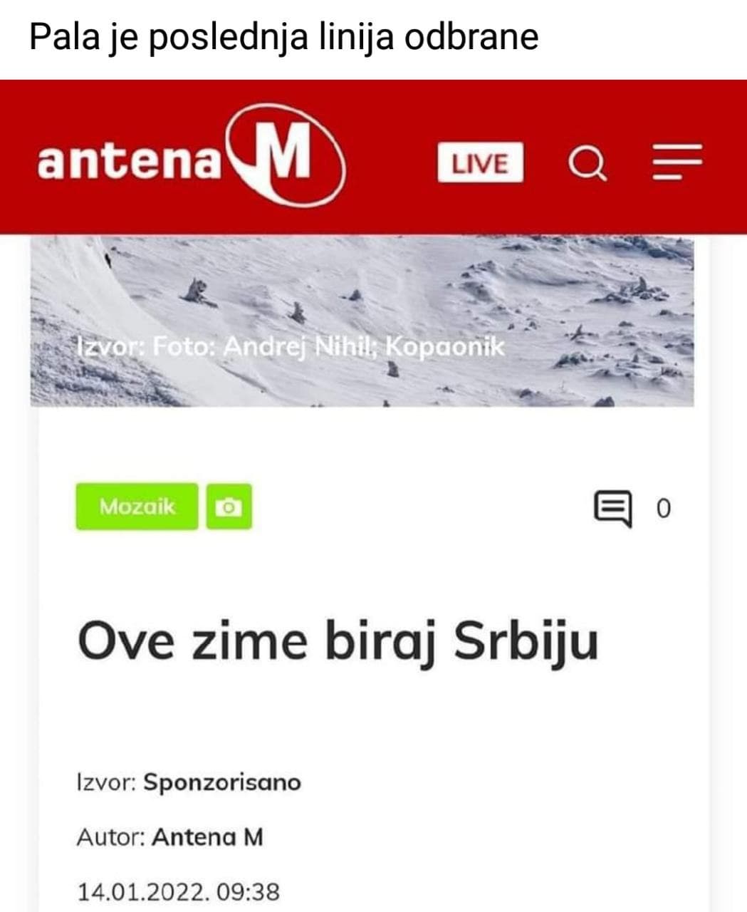 И, мада би била сасвим довољна таква историјска изјава тек прогледалог портала Антена М, они су наставили да аргументовано објашњавају зашто треба бирати Србију и зашто баш сада. У чланку наводе атрактивне српске дестинације, показујући тиме да су и они коначно почели подједнако да се поносе Авалом и Ловћеном!