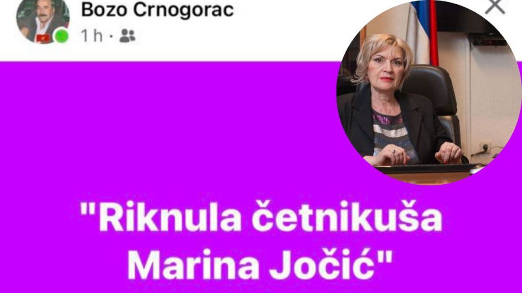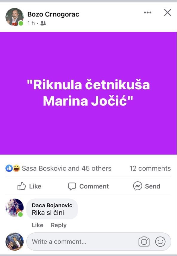 На фејсбук мрежи јутрос је тзв. Божо Црногорац објавио скандалозну објаву са текстом “Рикнула четникуша Марина Јочић“.