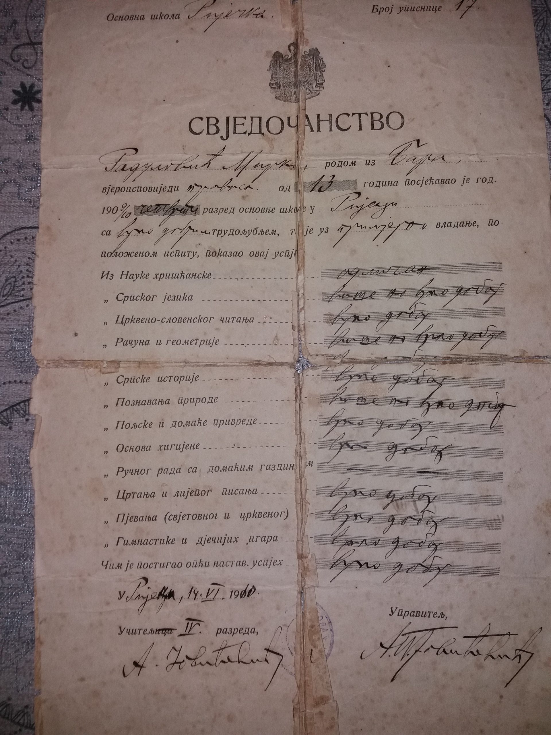 У редакцију нашег портала стигли су примјерци школских свједочанстава из 1910. и 1919. године од стране потомка некадашњег школарца Мирка Радуловића.