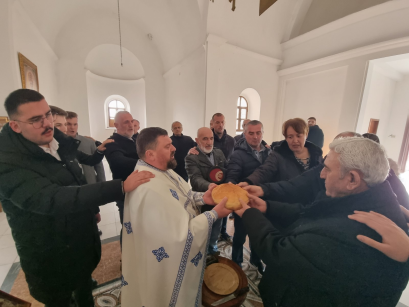 Послије причешћа вјермог народа освештан је и пререзан славски светосавски колач.