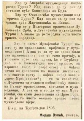 У допису учитеља Мираша Вукића из Бара поменуто је више муслиманских породица које, како је нагласио дописник, знају да њихово поријекло води од часних и јуначких српских кућа. Он је питао: