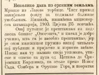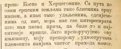 – Са пута по овим СРПСКИМ земљама тако блиским срцу нашем, а ипак тако удаљенима, одсијеченима од нас, мора нас све интересирати што нам писац прича, па биле то и најситније мрвице, објављено је на Цетињу 24. фебруара 1901. године.