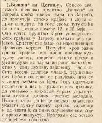 – ,,Српско академско пјевачко друштво ,,Балкан“ из Загреба креће овијех дана из Загреба да пропутује српске крајеве и свуда одржи концерте. На томе своме путу стићи ће и на Цетиње између 12. и 25. маја.