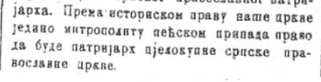 Према историjском праву наше Цркве једино митрополиту пећком припада право да буде патријарх цјелокупне Српске православне цркве. Чим се Црна Гора васпостави, митрополит пећки има бити проглашен, са свим његовим историjским правима за патријарха цјелокупне Српске православне цркве. Тога се права Црна Гора као вјечно слободна српска држава и као ослободитељка Пећи неће смјети никада одрећи, писао је ,,Глас Црногорца“ 7. октобра 1920. године.