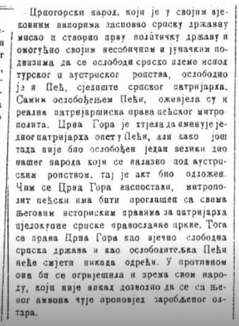 – Самим ослобођењем Пећи, оживјела су и реална патријаршијска права пећког митрополита. Црна Гора је хтјела да именује једног патријарха опет у Пећи, али како још тада није био ослобођен један велики дио нашег народа који се налазио под аустријским ропством, тај је акт био одложен, образлагао је ,,Глас Црногорца“.