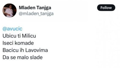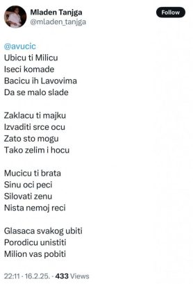 Подсећамо, на друштвеној мрежи „Икс“, овај опозиционар објавио је стихове у којима директно прети породици председника Александра Вучића.