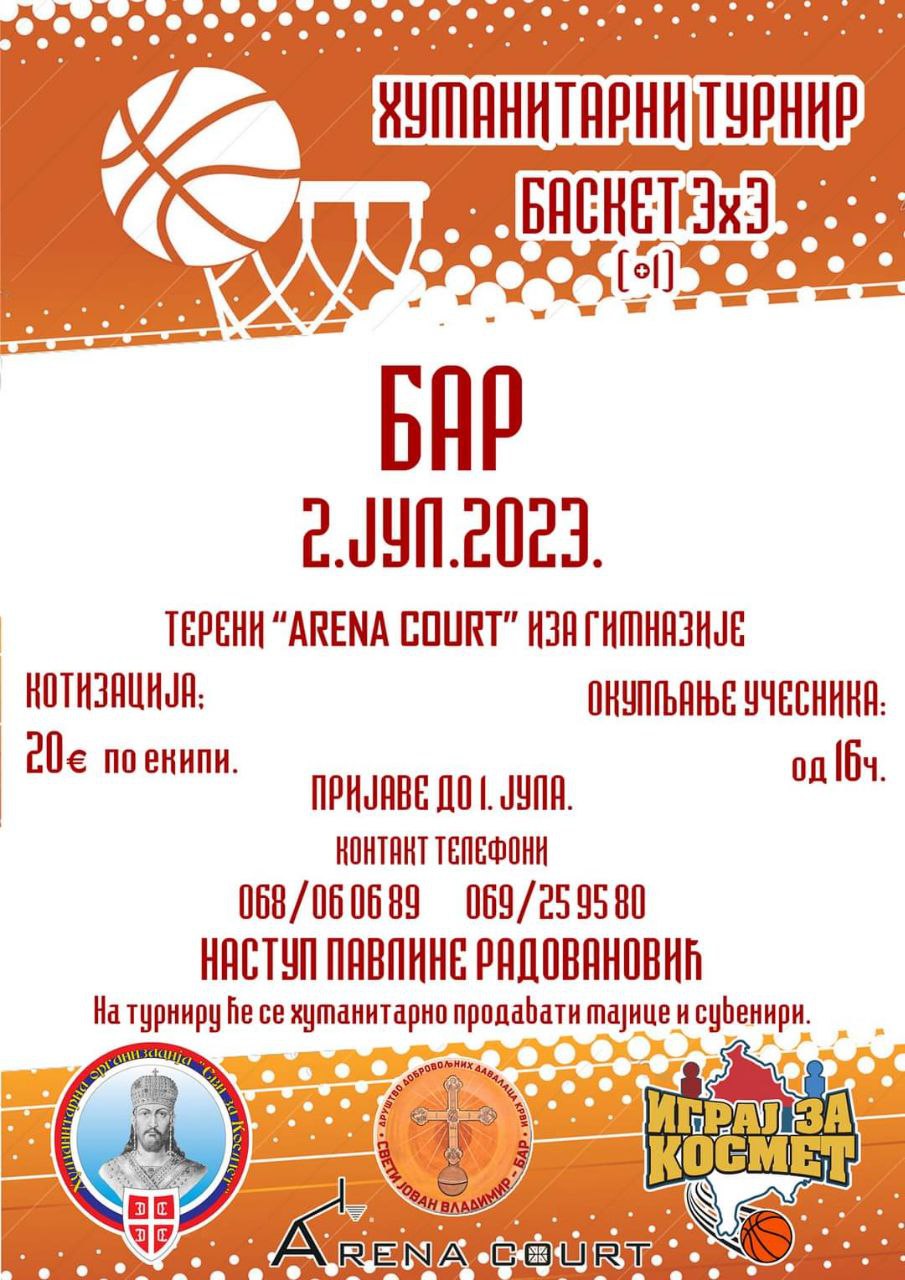 „Драга браћо и сестре, и ове године ће се, као и прошле, у организацији ХО „Сви За Космет“ и уз помоћ ДДДК „Свети Јован Владимир“ на најбољим теренима за кошарку у Црној Гори одржати турнир у баскету 3 на 3. „ARENA COURT“ терен се налази у непосредној близини нашег предивног Храма, а иза ОШ ‘Блажо Јоков Орландић’. Такође и ове године нам долази наша Павлина из угроженог Ораховца, да свима нама својим анђеоски гласом пренесе вапај тамошњег становништва„, саопштио је на друштвеним мрежама један од организатора Славко Клисић из Бара.