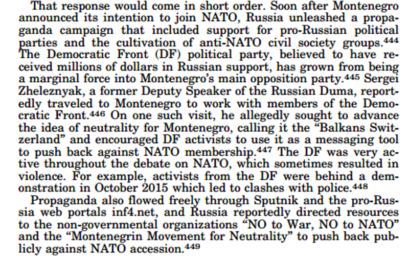 2018. године, у извјештају о утицају Русије на европске земље који су за Сенат САД припремиле Демократе, наводи се да је „пропаганда против НАТО у Црној Гори ишла преко Спутњика и проруског портала инф4.нет, а Русија је давала ресурсе невладином организацијама Не у рат, не у НАТО и Покрету за неутралност“.