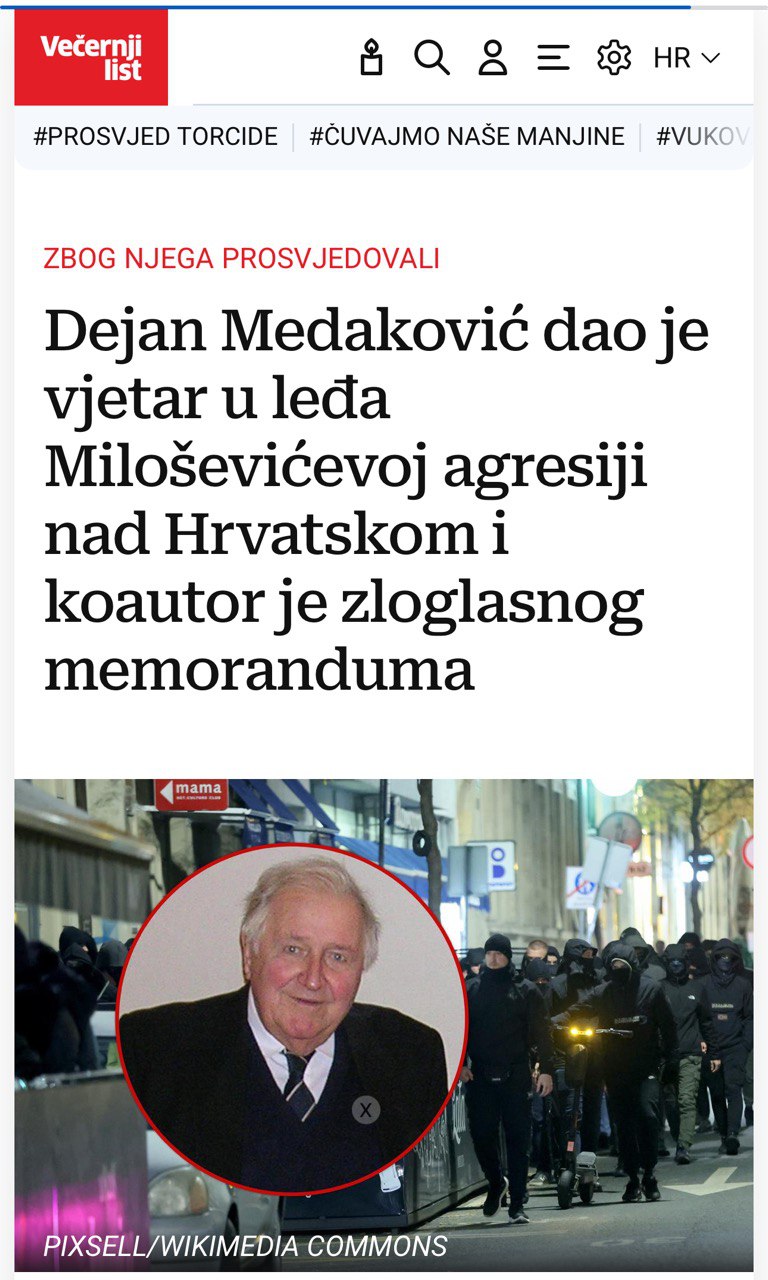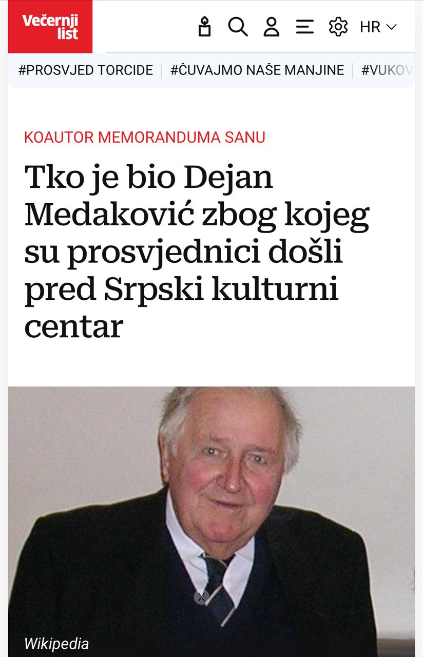 Посебно је занимљиво што су хулигани пред Српским културним центром очигледно припадали најнеобразованијем дијелу хрватског друштва — оном који, нажалост, засигурно не зна ко је био Дејан Медаковић нити шта је значио за европску културу. Управо тај профил учесника упућује да протест није био стихијски, већ организован; да се на улицу није изашло због „увријеђеног домољубља“, него на позив. Било би заиста занимљиво сазнати који је дио хрватске политичке или културне елите био толико посвећен да ангажује хрватску младост на овакав антицивилизацијски чин — и са којим мотивима.