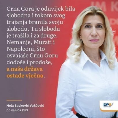 “Црна Гора је одувијек била слободна и током свог трајања бранила своју слободу. Ту слободу је тражила и за друге. Немање, Мурати и Наполеони, што освајаше Црну Гору, дођоше и прођоше, а наша држава остане вјечна”, тврди посланица ДПС-а.