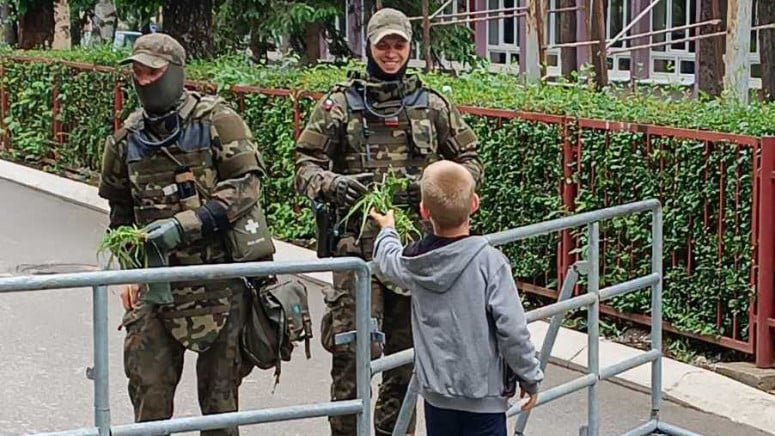У близини општинске зграде у Звечану, где је постављена монтажна ограда, један дечак је војницима Кфора, поводом празника Света Тројица, поклањао плетене венчиће од траве, преноси ТВ Мост.