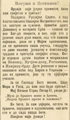 Његуши и Цетињани, оружје које примисте било вам свијетло и сретње! Подарено рускијем царем, а сад благословљено нашијем митрополитом, оно ће, наступе ли прилике, бранећи драгу домовину и интересе Срба – славом се ако Бог да покрити, поручио је књаз Никола својим сународницима 1896. године, када је Црна Гора добила значајну помоћ у виду оружја од братске Русије, а његове ријечи објавио је цетињски ,,Глас Црногорца“.