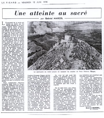 Касније, у вријеме кад сам кад сам водио међународну кампању за спас Ловћена, нашег српског Синаја, срео сам у катедрали париског надбискупа Данијела Пезрила коме сам у разговору у његовом кабинету, изнио нашу муку. Он је одмах разумио и упутио ме на свог пријатеља, великог хришћанског филозофа Габријела Марсела који се, добивши потребне податке, убрзо огласио у Фигару чланком речитиог наслова Насртај на светињу.