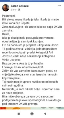 „Дакле, иако је дисциплински поступак против мене обустављен, ја сам ипак кажњен. И то на начин што је пројекат у који сам уложио 11 година живота и здравља, једном простом реченицом одузет и предат колегиници Ани Јововић, ћерки наше некадашње колегинице Винке Јововић„, написао је Лековић на свом Фејсбук профилу.