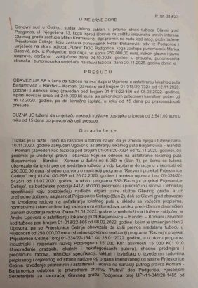 Основни суд у Цетињу донио је пресуду којом се Пријестоница Цетиње обавезује да исплати износ од 249.969,80 евра, уз законску затезну камату која тече од 16. децембра 2020. године до дана коначне исплате, саопштио је посланик Демократа Момчило Лековић.