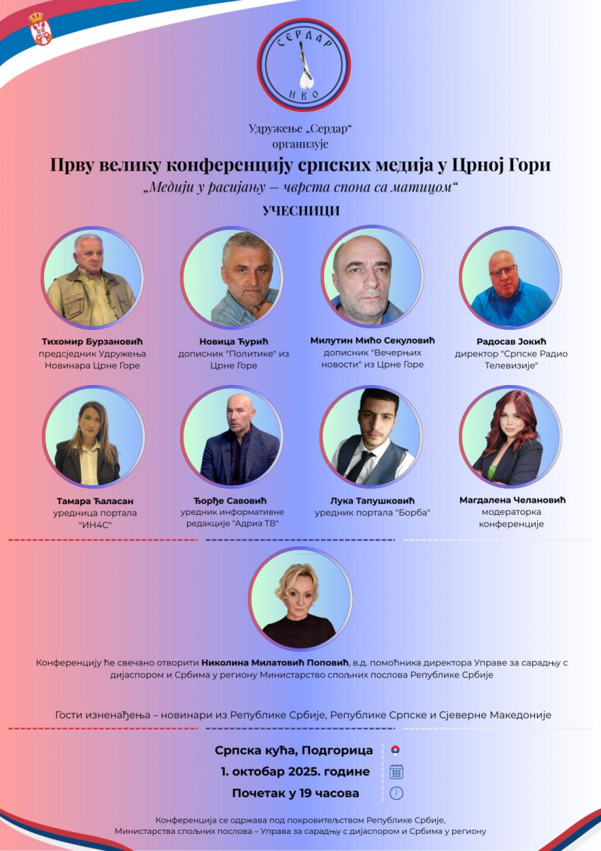 Удружење „Сердар“ организује велику конференцију сабрања српских медија у Црној Гори, под називом „Медији у расејању – чврста спона са матицом“.