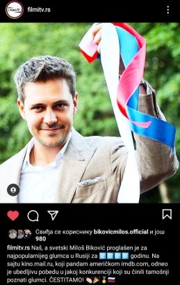 Милош Биковић изабран је за најпопуларнијег глумца у 2020. у Русији, према рангирању сајта kino.mail.ru.