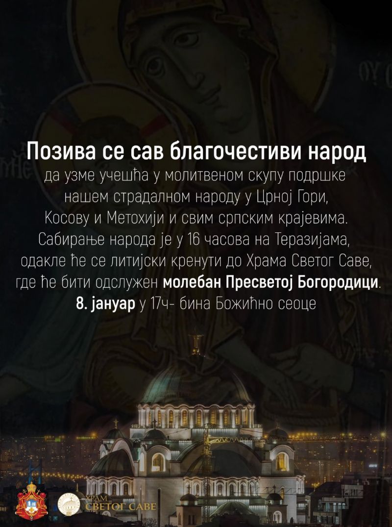 Са благословом Свјатјејшег Патријарха српског г. Иринеја, позива се сав благочестиви народ да 8. јануара 2020. године, узме учешћа у молитвеном скупу подршке нашем страдалном народу у Црној Гори, Косову и Метохији и свим српским крајевима.