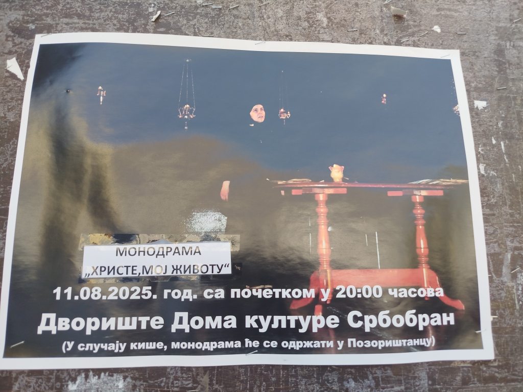 Са благословом Божијим и благословима Преподобне Стефаниде Скадарске, Дечанске и Битољске, и благословима Његове Светости Патријарха српског господина Порфирија и блаженопочившег Архипеископа цетињског и Митрополита црногорско-приморског г. Амфилохија, Монодрама „Христе мој животу“ се поново игра, овог пута у Србобрану у Дому културе у понедељак 11. августа 2025. године са почетком у 20 часова.