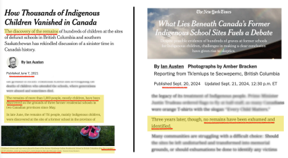 Упркос томе, Times никада није исправио текстове у којима је говорио о „остацима дјеце“ и „масовним гробницама“. Иронијом судбине, исти новинар, Остин, у чланку из 2024. године признаје да „три године касније ниједан људски остатак није ископан и идентификован“ — али редакција и даље не жели да исправи старе нетачности.