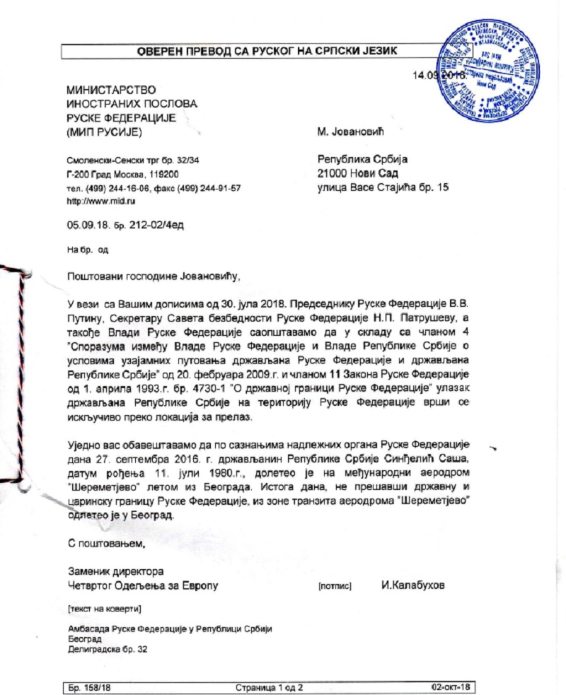 Уједно вас обавештавамо да је, по сазнањима надлежних органа Руске федерације, дана 27. септембра 2016. г. држављанин Републике Србије Синђелић Саша, датум рођења 11. јули 1980.г., долетео је на међународни аеродром „Шереметјево” летом из Београда. Истога дана, не прешавши државну и царинску границу Руске Федерације, из зоне транзита аеродрома ”Шереметјево” одлетео је у Београд„.